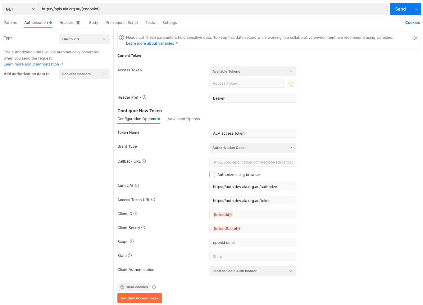 Client application details are required for access token generation. Please follow this step-by-step guide for Client Registration and Token Generation. The Token Generation functionality of the guide implements the ALA recommended Authentication Code Flow using PKCE flow mentioned below.